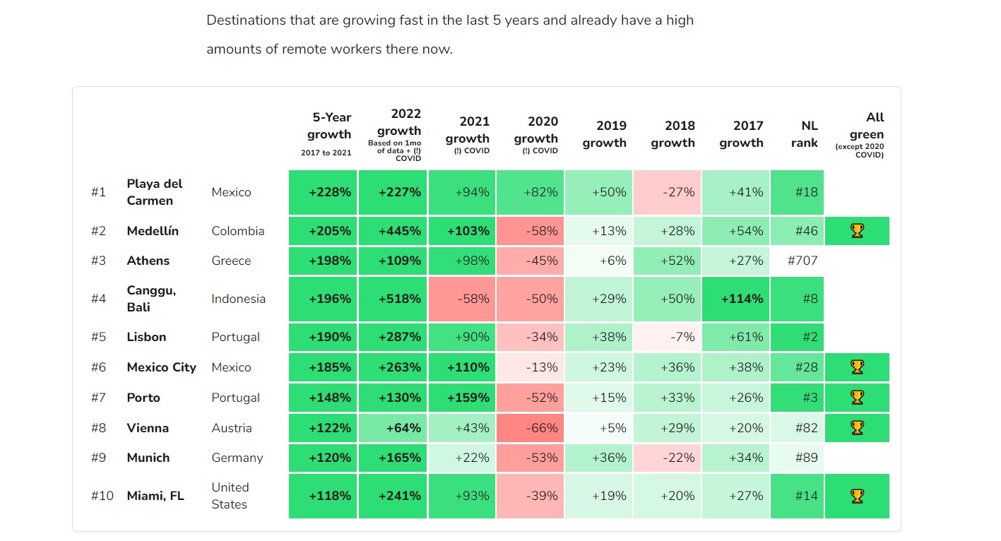 Η ελληνική πρωτεύουσα έχει τα τελευταία πέντε χρόνια, 2017-2021, τον τρίτο πιο γρήγορο ρυθμό ανάπτυξης, παγκοσμίως, μεταξύ των πιο δημοφιλών προορισμών για ψηφιακούς νομάδες. Τη μεγαλύτερη άνοδο στις προτιμήσεις των digital nomads, για το ίδιο χρονικό διάστημα, έχει το εξωτικό Playadel Carmen στο Μεξικό, ενώ δεύτερο στην κούρσα έρχεται το Μεδεγίν, η δεύτερη μεγαλύτερη πόλη της Κολομβίας.