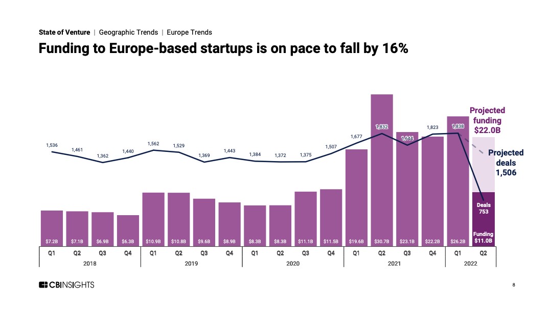 Η χρηματοδότηση από κεφάλαια επιχειρηματικών συμμετοχών αναμένεται να μειωθεί παγκοσμίως κατά 19% το β΄τρίμηνο του 2022, σε σχέση με το προηγούμενο τρίμηνο, εν μέσω χρηματιστηριακής πτώσης για τις μετοχές τεχνολογίας και του κλίματος μειωμένης ρευστότητας που δημιουργείται από τον πόλεμο στην Ουκρανία, γεγονός που αναμένεται να πλήξει άμεσα τις startup τεχνολογίας, οι οποίες ειδικά στην Ευρώπη θα δουν πτώση της χρηματοδότησης κατά 16%.