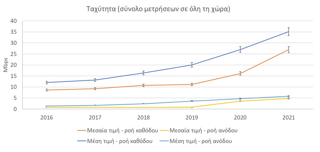 Τέλος η ΕΕΤΤ αναφέρει η σημαντική αύξηση της μέσης και μεσαίας τιμής της ταχύτητας καθόδου μέσα στη διάρκεια του 2021 αποδίδεται στην αύξηση του αριθμού τελικών χρηστών με σταθερές συνδέσεις δικτύων νέας γενιάς υψηλών ταχυτήτων όπως VDSL (50/100) και FTTΗ (100/200).