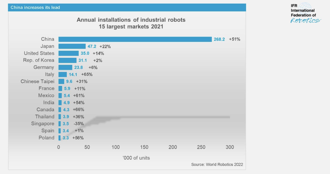 Η μεγαλύτερη αύξηση σημειώθηκε στην Κίνα, η βιομηχανία της οποίας απορρόφησε πάνω από το 50% των νέων ρομπότ, με 62.000 από αυτά να απορροφώνται στην αυτοκινητοβιομηχανία (σε ρυθμό διπλάσιο από πέρυσι). Ακολουθούν η τεχνολογικά προηγμένη Ιαπωνία, οι ΗΠΑ η Νότια Κορέα, και από ευρωπαϊκής πλευράς η Γερμανία και η γειτονική Ιταλία. Ειδικά στην Ευρώπη, οι νέες εγκαταστάσεις βιομηχανικών ρομπότ το 2021 αυξήθηκαν κατά 24%, με τη Γερμανία να αποκτά ποσοστό 28% του ευρωπαϊκού συνόλου, την Ιταλία 17% και τη Γαλλία 7%.
