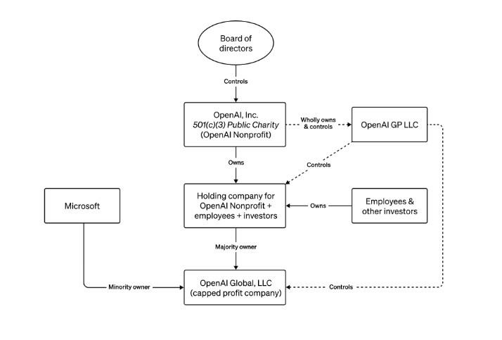 Όπως το ανέφερε η ίδια η OpenAI: «Η κερδοσκοπική θυγατρική ελέγχεται πλήρως από τη μη κερδοσκοπική OpenAI, της οποίας βασικός ευεργετούμενος είναι η ανθρωπότητα, όχι οι επενδυτές της OpenAI». Έτσι, οι επενδυτές δεν είχαν κανένα λόγο στο διοικητικό συμβούλιο και οι διευθυντές δεν επιτρεπόταν να κατέχουν μετοχές, ώστε να αποτραπεί σύγκρουση συμφερόντων, καθώς δεν θα έπρεπε να είναι ευθυγραμμισμένοι με τους μετόχους.