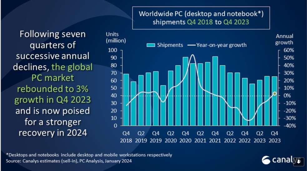 «Το 2023 ήταν μια δύσκολη χρονιά για τον κλάδο των υπολογιστών, αλλά οι κατασκευαστές έδειξαν ανθεκτικότητα και μπορούν πλέον να προσβλέπουν σε ένα βελτιωμένο τοπίο το 2024. Η συγκρατημένη αισιοδοξία μεταξύ των βασικών παραγόντων της αγοράς επιβεβαιώθηκε από μια ισχυρότερη -σε σχέση με πέρυσι- εορταστική περίοδο. Καθώς οι μακροοικονομικές συνθήκες συνεχίζουν να βελτιώνονται, εταιρείες και ιδιώτες που έχουν καθυστερήσει τις αγορές τους για πολλά τρίμηνα πρόκειται τώρα να ξαναρχίσουν τις δαπάνες για υπολογιστές», αναφέρουν οι αναλυτές της εταιρείας ερευνών Canalys.