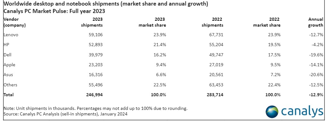 Η Lenovo ήταν ο αδιαφιλονίκητος πρωταγωνιστής της αγοράς ηλεκτρονικών υπολογιστών το 2023, με την εταιρεία να τερματίζει πρώτη στην παγκόσμια αγορά. Οι πωλήσεις της υπερέβησαν τα 59 εκατ. συσκευές, που μεταφράζεται σε μερίδιο αγοράς 23,9%. Πάντως, παρά την πρωτιά, η κινεζική εταιρεία είδε τις πωλήσεις της να μειώνονται σε σχέση με έναν χρόνο νωρίτερα, με το ποσοστό της πτώσης να κυμαίνεται στο επίπεδο του 12,7%.