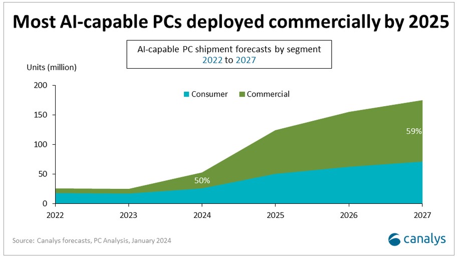«Αναμένουμε ότι ένας στους πέντε υπολογιστές που θα πωληθούν το 2024 θα έχει δυνατότητα AI. Η διείσδυση εκτιμάται ότι θα αυξηθεί τάχιστα, ειδικά στον εμπορικό τομέα, όπου τα οφέλη της τεχνητής νοημοσύνης σχετίζονται με την αύξηση της παραγωγικότητας, την ασφάλεια και τη μείωση του κόστους», αναφέρουν οι αναλυτές της Canalys.