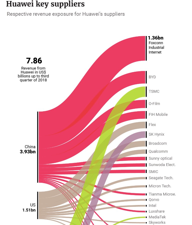 Πριν από το 2019, η λίστα ξένων προμηθευτών της Huawei ήταν μακρά, σύμφωνα με στοιχεία από την Goldman Sachs από το 2018.