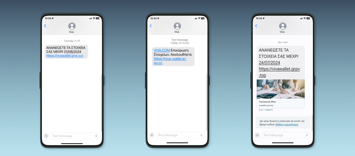Σε σημαντικό ποσοστό των προσπαθειών απάτης, οι απατεώνες στέλνουν ψεύτικα μηνύματα κειμένου προσποιούμενοι ότι προέρχονται από το viva.com (πρώην Viva Wallet). Αυτά τα μηνύματα σας ζητούν να κάνετε κλικ σε έναν ψεύτικο σύνδεσμο με το πρόσχημα της ενημέρωσης των στοιχείων σας ή της αντιμετώπισης ενός ζητήματος ασφαλείας. Αυτά τα μηνύματα δεν αποστέλλονται από το viva.com.
