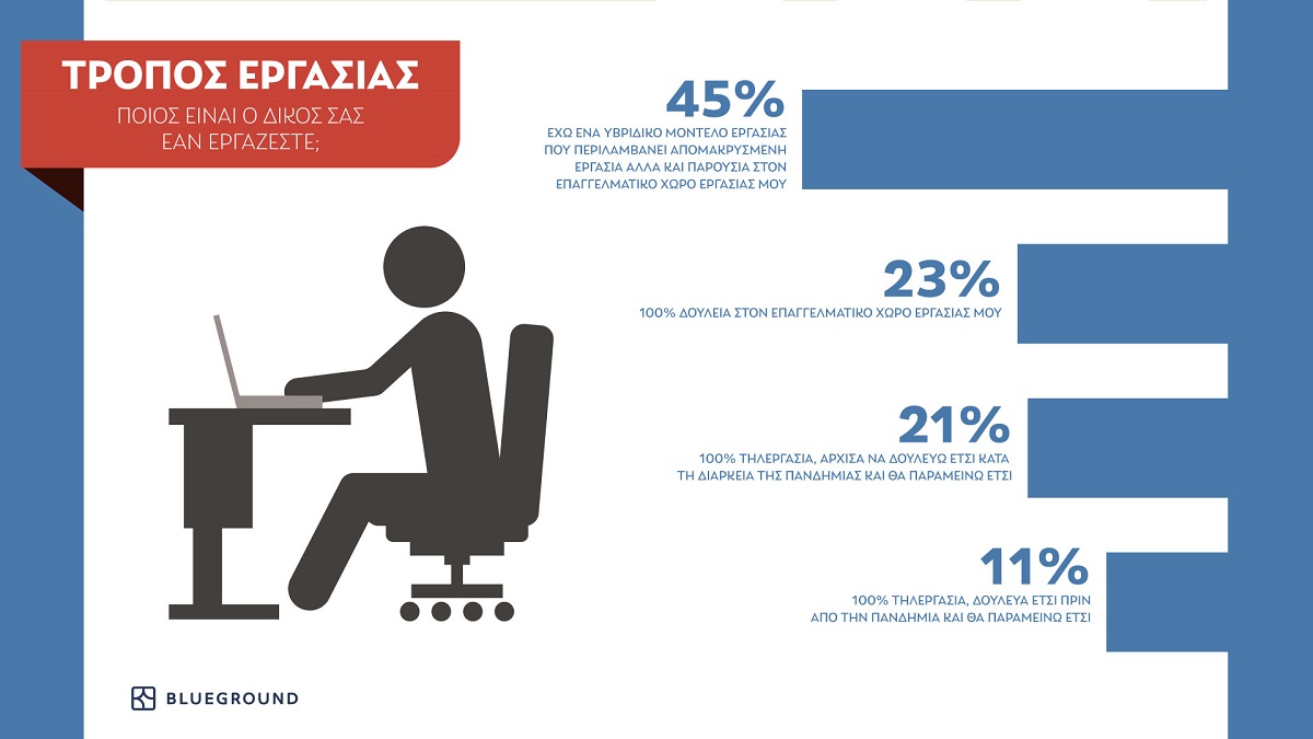 Το 80% των ενοίκων της Blueground που συμμετείχαν στην έρευνα απάντησαν πως ιδανικότερο θεωρούν το υβριδικό μοντέλο εργασίας (συνδυασμό τηλεργασίας και εργασίας από το γραφείο), καθώς τους προσφέρει ευελιξία και παράλληλα τους βοηθά να διατηρούν στενή επαφή με τους συνεργάτες τους.