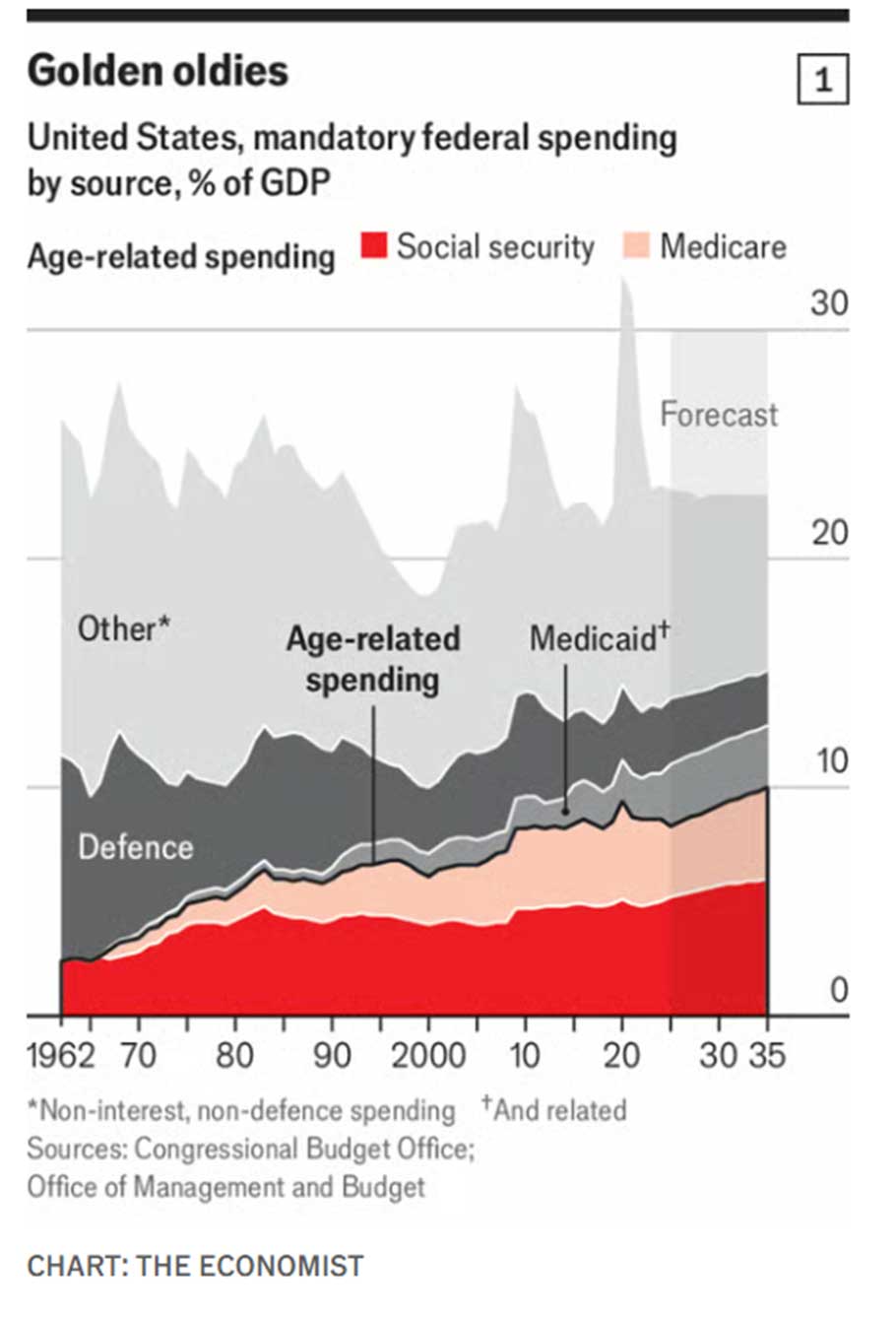 Η γήρανση των πληθυσμών αναδιαμορφώνει πλήρως τη σύνθεση των κρατικών δαπανών (βλ. διάγραμμα 1). Τα κράτη πρόνοιας εξακολουθούν να στηρίζουν τους φτωχούς. Ακόμα και η Αμερική που βρίσκεται στο κόκκινο, λόγω χρέους, παρέχει βοηθήματα στο κατώτερο πεμπτημόριο σε επίπεδο 90% του εισοδήματός τους προ φόρων. Όμως, από το 1980 οι μεταβιβάσεις προς τους ηλικιωμένους και οι δαπάνες για την υγειονομική περίθαλψη – οι οποίες επικεντρώνονται σε συντριπτικό βαθμό σε αυτούς – αυξήθηκαν κατά περίπου 5% του ΑΕΠ στην ομάδα των πλούσιων χωρών του ΟΟΣΑ, αύξηση διπλάσια από αυτή των άλλων κοινωνικών δαπανών. Σύμφωνα με το ΔΝΤ, οι προηγμένες οικονομίες της G20, με τις τρέχουσες πορείες τους, μέχρι το 2030, θα ξοδεύουν ετησίως επιπλέον 2,4% του ΑΕΠ για συντάξεις και υγειονομική περίθαλψη, σε σχέση με το 2023.