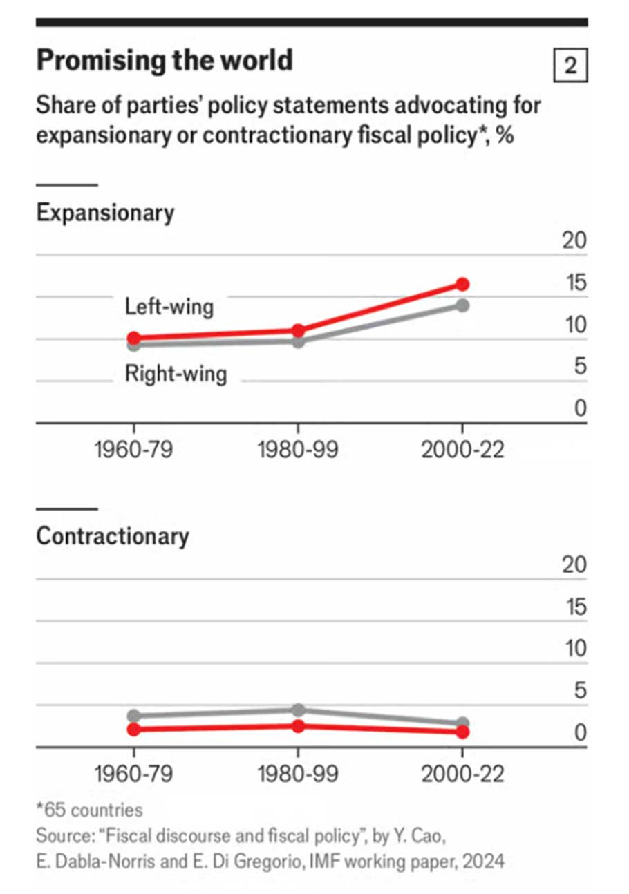 Οι προτάσεις για πραγματοποίηση ακόμα και μικρών αλλαγών στις συνταξιοδοτικές παροχές προκαλούν οργή και διαμαρτυρίες. Το 2023 περισσότεροι από 1 εκατομμύριο Γάλλοι διαδήλωσαν κατά της σταδιακής αύξησης της ηλικίας συνταξιοδότησης από τα 62 στα 64 έτη. Η μεταρρύθμιση προωθήθηκε με τη χρήση ειδικών συνταγματικών εξουσιών. Η Ιταλία αποδυνάμωσε τις μεταρρυθμίσεις για τη συνταξιοδότηση που είχαν νομοθετηθεί το 2011. Η κυβέρνηση των Εργατικών της Βρετανίας ανακοίνωσε το 2024 ότι θα ελέγξει τα μέσα για το «χειμερινό επίδομα καυσίμων» – ένα ετήσιο καθολικό βοήθημα 300 λιρών (405 δολαρίων) που για τους περισσότερους δικαιούχους έχει ελάχιστη σχέση με τη θέρμανση. Αναγκάστηκε σχεδόν να αποσύρει την πρόταση. Καθώς οι πληθυσμοί γερνούν, η πολιτική φαίνεται να έχει μετατραπεί σε πόλεμο προσφορών: αναλύοντας τις διακηρύξεις των πολιτικών κομμάτων σε 65 χώρες, οι ερευνητές του ΔΝΤ διαπίστωσαν ότι τόσο τα αριστερά όσο και τα δεξιά κόμματα έχουν γίνει αισθητά πιο επεκτατικά στις υποσχέσεις τους από το 1990 περίπου (βλ. διάγραμμα 2). Οι μετατοπίσεις της πολιτικής ρητορικής προς τον επεκτατισμό τείνουν να ακολουθούνται από μεγαλύτερα ελλείμματα.