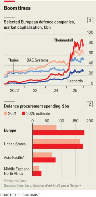 Μια «εποχή επανεξοπλισμού» σαρώνει την Ευρώπη, όπως δήλωσε νωρίτερα φέτος ο Armin Papperger, επικεφαλής της Rheinmetall — και οι επενδυτές του γερμανικού αμυντικού κολοσσού δείχνουν να τον πιστεύουν απόλυτα. Από την αρχή του έτους, η χρηματιστηριακή αξία της εταιρείας έχει εκτιναχθεί από τα 27 δισ. ευρώ (31 δισ. δολάρια) στα 80 δισ., αγγίζοντας επίπεδα ρεκόρ — 90 φορές τα ετήσια καθαρά της κέρδη — και πλησιάζοντας πλέον σε μέγεθος τη Lockheed Martin, τον αμερικανικό γίγαντα της άμυνας. Παρόμοια εκρηκτική άνοδος παρατηρείται και σε άλλους ευρωπαϊκούς αναδόχους, όπως η βρετανική BAE Systems, η γαλλική Thales και η ιταλική Leonardo (βλ. διάγραμμα 1).