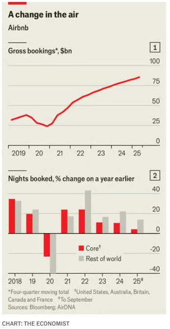 Τον τελευταίο καιρό, ωστόσο, η ανάπτυξη της Airbnb φαίνεται στάσιμη. Η αβεβαιότητα που προκάλεσαν οι on-and-off δασμοί του προέδρου Donald Trump οδήγησε τους καταναλωτές να καθυστερήσουν τις κρατήσεις τους. Οι υπεύθυνοι χάραξης πολιτικής σε πόλεις από το Παρίσι έως τη Νέα Υόρκη εφαρμόζουν περιορισμούς στην πλατφόρμα, η οποία πιστεύουν ότι συμβάλλει στην εκτίναξη των τιμών των κατοικιών. Ο ανταγωνισμός για τις βραχυχρόνιες μισθώσεις από ταξιδιωτικές ιστοσελίδες όπως η Booking.com και η Expedia εντείνεται. Η διαδικτυακή κίνηση στην Airbnb επιβραδύνεται.