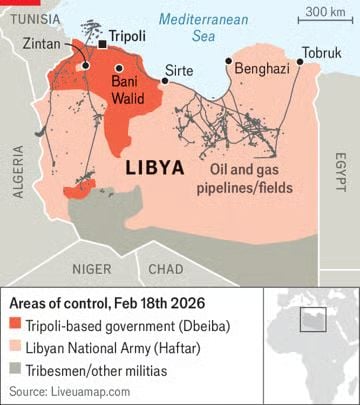 Εν τω μεταξύ, το κράτος μαραζώνει. Στα χαρτιά, η παραγωγή πετρελαίου το 2025 ήταν σταθερή. Ωστόσο, οι αναλυτές λένε ότι πέρυσι εξαφανίστηκαν 8 δισ. δολάρια από τα περισσότερα από 30 δισ. δολάρια των αναμενόμενων εσόδων από το πετρέλαιο. Οι δύο εξουσιαστές της χώρας έχουν καταλάβει πετρελαιοπηγές, διαβρώνοντας το μονοπώλιο της Εθνικής Εταιρείας Πετρελαίου στην παραγωγή και τις πωλήσεις. Και έχουν «πείσει» την κεντρική τράπεζα να αποδεσμεύσει τα μειούμενα έσοδα ως ενέγγυες πιστώσεις. Η ρευστότητα είναι περιορισμένη. Οι τράπεζες περιορίζουν τις αναλήψεις. Το δηνάριο διολισθαίνει στη μαύρη αγορά και το κόστος των βασικών ειδών διατροφής ανεβαίνει.