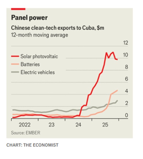 Ωστόσο, τα πράγματα δεν είναι τόσο άσχημα όσο θα μπορούσαν να είναι, και όχι μόνο επειδή το νησί καλύπτει το 40% των αναγκών του σε καύσιμα με το δικό του βαρύ, θειούχο αργό πετρέλαιο. Ο κ. Trump έχει εμμονή με το πετρέλαιο, αλλά η Κούβα αναπτύσσει μια εναλλακτική πηγή ενεργειακού εφοδιασμού με ρυθμούς ρεκόρ: ηλιακούς συλλέκτες που εισάγονται από την Κίνα. Σύμφωνα με τα στοιχεία κινεζικών εξαγωγών που συγκέντρωσε το Ember, ένα κέντρο μελετών, κατά τους 12 μήνες έως τον Απρίλιο του 2025 οι εισαγωγές κινεζικών ηλιακών συλλεκτών από την Κούβα αυξήθηκαν κατά 34 φορές, ταχύτερα από οπουδήποτε αλλού στον κόσμο. Το νησί που πριν από λίγα χρόνια δεν είχε σχεδόν καθόλου ηλιακή ενέργεια, έχει φτάσει σε επίπεδα που το βοηθούν να αντιμετωπίσει το εμπάργκο του κ. Trump.