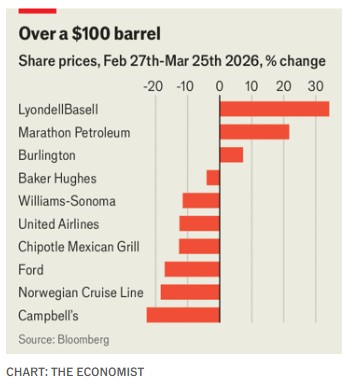 Για τις αμερικανικές επιχειρήσεις η κατάσταση δημιουργεί νικητές και χαμένους. Ορισμένοι είναι προφανείς. Οι υψηλότερες τιμές αποτελούν καλά νέα για τον κλάδο πετρελαίου και φυσικού αερίου — τουλάχιστον βραχυπρόθεσμα. Οι εισηγμένες εταιρείες του κλάδου έχουν δει τις μετοχές τους από τις 27 Φεβρουαρίου να ενισχύονται κατά μέσο όρο πάνω από 8%. Αντίθετα, οι αεροπορικές εταιρείες και οι εταιρείες κρουαζιέρας δέχονται ισχυρό χτύπημα. Οι περισσότερες αεροπορικές στις ΗΠΑ έχουν εδώ και καιρό εγκαταλείψει την πρακτική της αντιστάθμισης του κόστους καυσίμων μέσω συμβολαίων μελλοντικής εκπλήρωσης. Από τα τέλη Φεβρουαρίου, η μετοχή της American Airlines υποχώρησε κατά 20%, ενώ της United κατά 13%. (Η Delta, η οποία είναι πιο προστατευμένη επειδή διαθέτει διυλιστήριο στην Πενσυλβάνια που καλύπτει τα τρία τέταρτα των εγχώριων αναγκών της σε καύσιμα, έχει δει τη μετοχή της να ενισχύεται κατά 3%.) Εταιρείες που εξαρτώνται από προαιρετικές δαπάνες των καταναλωτών —όπως η αλυσίδα μεξικανικού φαγητού Chipotle, η Nike και η Williams Sonoma, η οποία πουλά πολυτελή είδη κουζίνας— έχουν χάσει από τα τέλη Φεβρουαρίου από 12% έως 15% της χρηματιστηριακής τους αξίας.