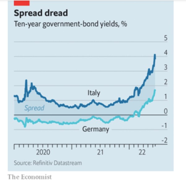 Ο καλπάζων πληθωρισμός και η αποδυνάμωση της οικονομίας δεν είναι τα μόνα που απασχολούν την Ευρωπαϊκή Κεντρική Τράπεζα (ΕΚΤ). Καθώς ο πληθωρισμός συνέχιζε την ανοδική του πορεία, η τράπεζα υποσχέθηκε στις 9 Ιουνίου να αυξήσει τα επιτόκια τους επόμενους μήνες και να τερματίσει τις αγορές περιουσιακών στοιχείων. Στη συνέχεια, τις επόμενες ημέρες, οι χρηματοπιστωτικές αγορές αποφάσισαν να υπενθυμίσουν στην κεντρική τράπεζα ότι η νέα πολιτική θα μπορούσε να σημαίνει ότι το δημόσιο χρέος της Ιταλίας, στο 150% του ΑΕΠ της χώρας, θα κλυδωνιζόταν καθώς τα επιτόκια θα άρχιζαν να αυξάνονται. Το κόστος δανεισμού του ιταλικού δημοσίου άρχισε να ανεβαίνει.