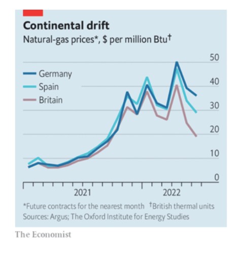 Πλέον, η χονδρική τιμή του φυσικού αερίου είναι ακριβότερη στη Γερμανία και την ανατολική Ευρώπη, λόγω της μείωσης της παροχής μέσω του Nord Stream (βλ. διάγραμμα).