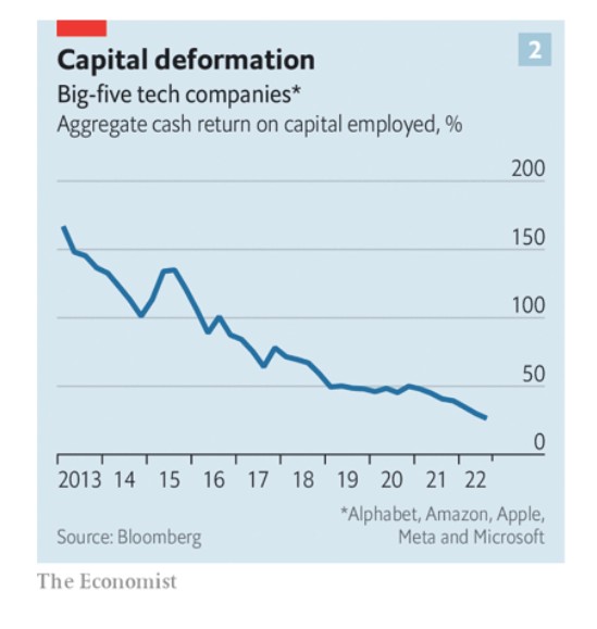 Τα αφεντικά των τεχνολογικών γιγάντων δεν αντιμετωπίζουν έναν τέτοιο αυτόματο μηχανισμό πειθάρχησης. Όσο οι βασικές δραστηριότητες των εταιρειών έβγαζαν χρήμα, οι επενδυτές έκαναν τα χατίρια τους και ανέχονταν τις μειωμένες αποδόσεις κεφαλαίου σε ορισμένες εταιρείες. Συνολικά για τις πέντε μεγάλες εταιρείες, η απόδοση αυτή έχει μειωθεί περισσότερο από το μισό τα τελευταία πέντε χρόνια.