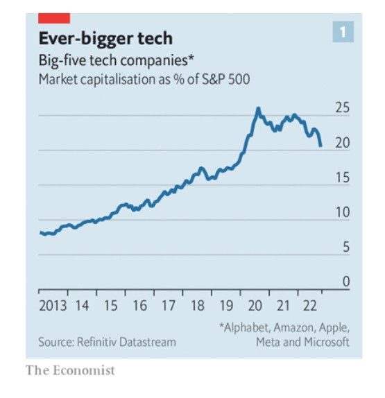 Το ένα πέμπτο της αγοραίας αξίας του δείκτη S&P 500 των μεγάλων αμερικανικών επιχειρήσεων βρίσκεται σε πέντε γιγαντιαίες εταιρείες τεχνολογίας – την Alphabet, την Amazon, την Apple, την Meta και την Microsoft- οι οποίες έχουν δαπανήσει μέρος των κερδών τους κυνηγώντας τη διαφοροποίηση.