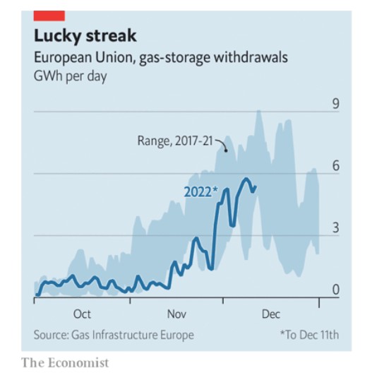 Το φυσικό αέριο αποσύρθηκε από τις αποθήκες, αλλά σε επίπεδα πολύ εντός των ιστορικών ορίων. Το υγροποιημένο φυσικό αέριο κατέφτασε στα λιμάνια της Ευρώπης σε ποσότητες ρεκόρ. Οι τιμές των συμβολαίων φυσικού αερίου μελλοντικής εκπλήρωσης για τις αρχές του 2023 ανέβηκαν, καθώς οι έμποροι συνυπολόγισαν τις καιρικές συνθήκες, αλλά η άνοδος δεν ήταν τόσο απότομη.