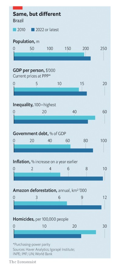 Ο Lula έχει μπροστά του ένα δύσκολο έργο, εξαιτίας του οικονομικού τέλματος στο οποίο ο κ. Bolsonaro οδήγησε τη Βραζιλία. Η ανάπτυξη, η οποία, το 2022, σύμφωνα με τις εκτιμήσεις της κεντρικής τράπεζας ήταν 2,9%, χάρη στις άφθονες προεκλογικές δαπάνες στήριξης, αναμένεται να πέσει στο 1% το 2023. Ο πληθωρισμός μειώθηκε από το ανώτατο επίπεδο του 12% τον Απρίλιο στο 6% τον Νοέμβριο. Ωστόσο, ο αριθμός των Βραζιλιάνων που δεν έχουν τα προς το ζην αυξήθηκε από 6%, λίγο πριν την ανάληψη των καθηκόντων του κ. Bolsonaro το 2019, σε 16%. Η κυβέρνησή του υποσχέθηκε φιλελεύθερες οικονομικές μεταρρυθμίσεις, αλλά, εκτός από την προσπάθεια να θέσει τις δημόσιες συντάξεις σε υγιέστερη βάση, απέτυχε να εφαρμόσει τις περισσότερες από αυτές. Το χρέος της Βραζιλίας παρέμεινε επί των ημερών του στο πεισματικά υψηλό 75% του ΑΕΠ.