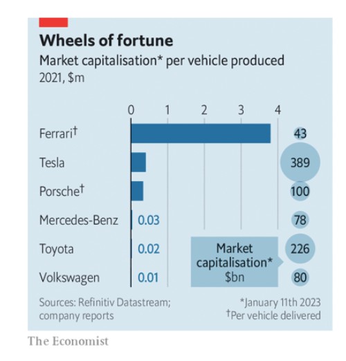 Η κεφαλαιοποίηση της Ferrari, ύψους 43 δισ. δολαρίων, την καθιστά την 11η πιο πολύτιμη εισηγμένη αυτοκινητοβιομηχανία στον κόσμο. Όσον αφορά την αγοραία αξία ανά πωληθέν αυτοκίνητο, βρίσκεται μίλια μπροστά από την υπόλοιπη αγορά (βλ. διάγραμμα). Το ίδιο και η Rolls, αν ήταν ανεξάρτητη εταιρεία. Και οι δύο έχουν χειριστεί με επιδεξιότητα την αγορά πολυτελών ειδών, διατηρώντας την προσφορά υπό έλεγχο και τις τιμές σε υψηλά επίπεδα.
