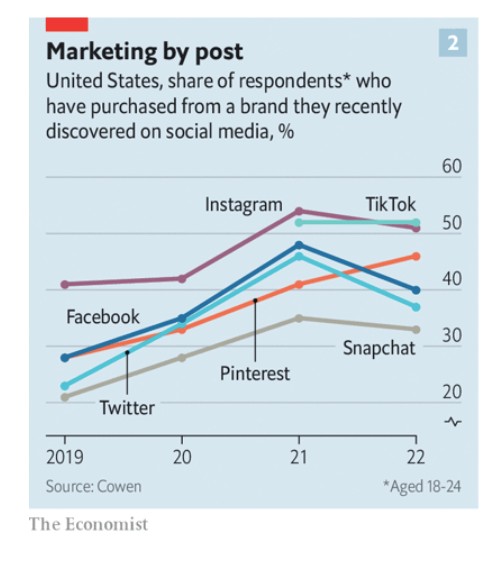Το Διαδίκτυο έχει επίσης αλλάξει τον τρόπο με τον οποίο οι νέοι ανακαλύπτουν τις μάρκες. Η έντυπη διαφήμιση, οι διαφημιστικές πινακίδες ή η τηλεόραση έχουν δώσει τη θέση τους στα μέσα κοινωνικής δικτύωσης. Το Instagram, μέρος της αυτοκρατορίας της Meta, και το TikTok, η κινεζικής ιδιοκτησίας εφαρμογή ανταλλαγής βίντεο, είναι τα μέρη όπου οι νέοι αναζητούν έμπνευση, ιδίως για αγαθά όπου η εμφάνιση έχει σημασία, όπως η μόδα, η ομορφιά και τα αθλητικά είδη. Τα βίντεο που δημιουργούνται από τους χρήστες του TikTok μπορούν να εκτοξεύσουν τη φήμη ακόμα και σε πολύ μικρές μάρκες, αν γίνουν viral. Τέτοιες εφαρμογές προσθέτουν συνεχώς λειτουργίες που επιτρέπουν στους χρήστες να κάνουν αγορές χωρίς να εγκαταλείπουν ποτέ την πλατφόρμα. Σύμφωνα με τη McKinsey, μέχρι το 2021 έξι στους δέκα Αμερικανούς κάτω των 25 ετών είχαν πραγματοποιήσει κάποια αγορά σε έναν ιστότοπο κοινωνικής δικτύωσης. Ορισμένες ακολουθούν το κινεζικό μοντέλο του «κοινωνικού εμπορίου», συνδυάζοντας την ψυχαγωγία που μεταδίδεται σε ζωντανή ροή με μια ευκαιρία για αγορά.