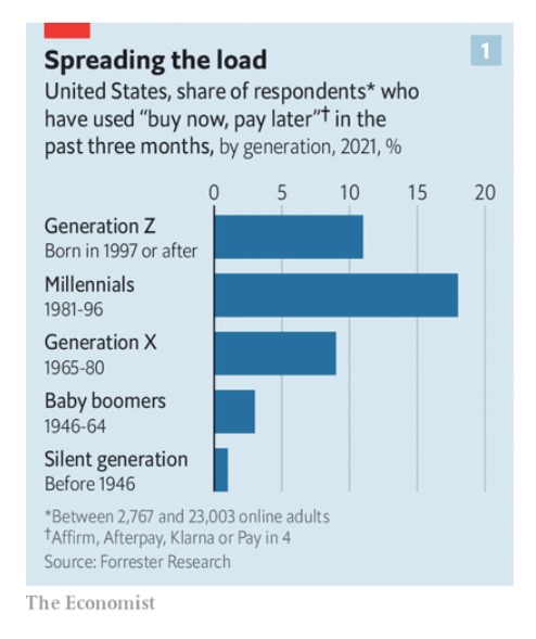 Η εύκολη πρόσβαση σε μέσα διασποράς των πληρωμών μπορεί να ενθαρρύνει τη σπατάλη. Σύμφωνα με μια άλλη έρευνα της McKinsey τον Οκτώβριο, το 45% των Ευρωπαίων στην εφηβεία και στις αρχές των 20 ετών σχεδίαζαν κάποιου είδους σπατάλη τους επόμενους τρεις μήνες, ενώ το 83% των Boomers, που γεννήθηκαν πριν από το 1964, είπαν «όχι» σε μια τέτοια «ακολασία». Η Forrester, μια εταιρεία έρευνας αγοράς, διαπίστωσε ότι οι περισσότεροι χρήστες των εφαρμογών «αγοράζω τώρα, πληρώνω αργότερα» είναι γύρω στα 20. Η Megan Scott, μια 20χρονη φοιτήτρια από το Λονδίνο, μιλάει εκ μέρους πολλών συνομηλίκων της και παραδέχεται ότι, όταν ψωνίζει, δεν έχει κανέναν περιορισμό -μέχρι να έρθει ο λογαριασμός, τουλάχιστον.