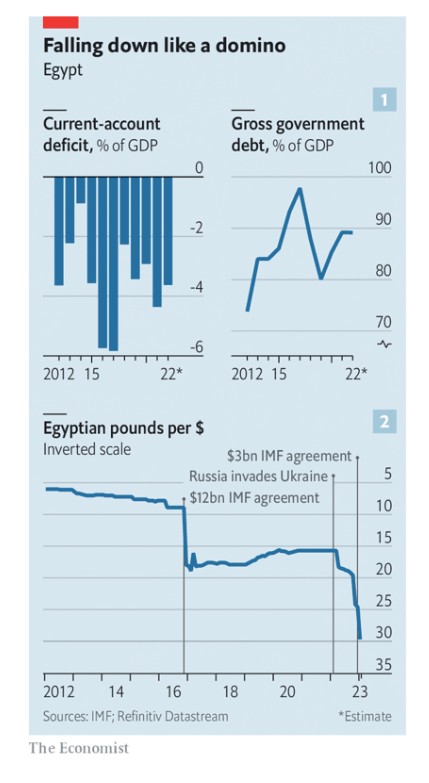 Η κατάρρευση ξεκίνησε με την εισβολή της Ρωσίας στην Ουκρανία, η οποία οδήγησε τους φοβισμένους επενδυτές μέσα σε λίγους μήνες να αποσύρουν επενδύσεις χαρτοφυλακίου ύψους 22 δισ. δολαρίων από την Αίγυπτο. Αυτή η απόσυρση επιδείνωσε την έλλειψη σκληρού νομίσματος. Η κυβέρνηση περιόρισε τις εισαγωγές για να μειώσει το εμπορικό έλλειμμα και επέστρεψε στο ΔΝΤ για ακόμα ένα δάνειο, το τέταρτο από το 2016 (τον Δεκέμβριο έλαβε τελικά 3 δισ. δολάρια). Τον Ιούνιο ο Muhammad Maait, ο υπουργός Οικονομικών, δήλωσε ότι η χώρα του έπρεπε να επικεντρωθεί στη δημιουργία λιγότερο ασταθών ειδών εισροών, όπως οι άμεσες ξένες επενδύσεις και τα έσοδα από τις εξαγωγές. «Το μάθημα που πήραμε (είναι ότι) δεν μπορούμε να βασιζόμαστε στο ζεστό χρήμα», είπε.