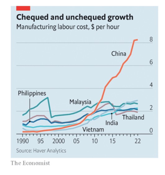 Ωστόσο, υπό τον βαρύ συνδυασμό εμπορικών και πολιτικών πιέσεων, οι ξένες εταιρείες αρχίζουν όλο και περισσότερο να βρίσκουν το κουράγιο, αν όχι να εγκαταλείψουν την Κίνα εντελώς, τουλάχιστον να αναζητήσουν την ανάπτυξη πέρα από αυτήν. Τα εργατικά χέρια στην Κίνα δεν είναι πλέον τόσο φθηνά: μεταξύ 2013 και 2022 οι μισθοί στη μεταποίηση διπλασιάστηκαν, σε μέσο όρο 8,27 δολάρια την ώρα. Το πιο σημαντικό είναι ότι η εντεινόμενη τεχνολογική αποσύνδεση μεταξύ Πεκίνου και Ουάσινγκτον αναγκάζει τους κατασκευαστές προϊόντων υψηλής τεχνολογίας, ιδίως εκείνων που περιλαμβάνουν προηγμένους ημιαγωγούς, να επανεξετάσουν την εξάρτησή τους από την Κίνα.