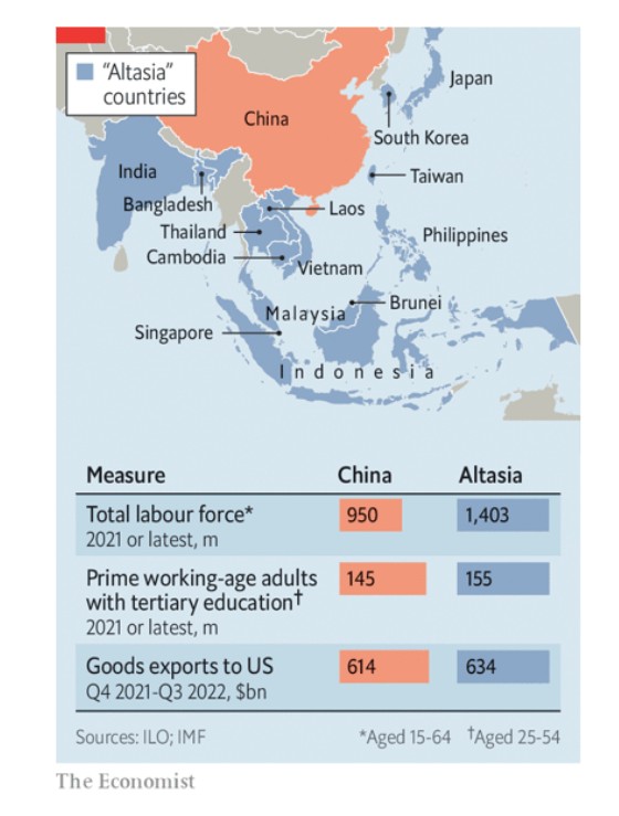 Χάρη στις ιαπωνικές εταιρείες, οι οποίες έχουν δημιουργήσει εφοδιαστικές αλυσίδες στη Νοτιοανατολική Ασία εδώ και δεκαετίες, υπάρχει ήδη ένα μοντέλο για την οικονομία της Altasia. Πιο πρόσφατα, ο πλούσιος γείτονας της Ιαπωνίας στην Altasia, η Νότια Κορέα, ακολούθησε το παράδειγμά της. Το 2020 οι συνολικές άμεσες επενδύσεις των νοτιοκορεατικών επιχειρήσεων στο Μπρουνέι, την Καμπότζη, την Ινδονησία, το Λάος, τη Μαλαισία, τις Φιλιππίνες, τη Σιγκαπούρη, την Ταϊλάνδη και το Βιετνάμ – που μαζί με την ασταθή Μιανμάρ αποτελούν την Ένωση Χωρών της Νοτιοανατολικών Ασίας (ΑSΕΑΝ) – και το Μπαγκλαντές έφθασαν τα 96 δισ. δολάρια, ξεπερνώντας οριακά τις κορεατικές επενδύσεις στην Κίνα. Μόλις πριν από μια δεκαετία, οι επενδύσεις των κορεατικών εταιρειών στην Κίνα ήταν σχεδόν διπλάσιες από εκείνες στην Altasia. Η Samsung είναι ο μεγαλύτερος ξένος επενδυτής στο Βιετνάμ. Πέρυσι η νοτιοκορεατική αυτοκινητοβιομηχανία Hyundai, άνοιξε το πρώτο της εργοστάσιο στην Ασία, κατασκευάζοντας ηλεκτρικά οχήματα στην Ινδονησία.