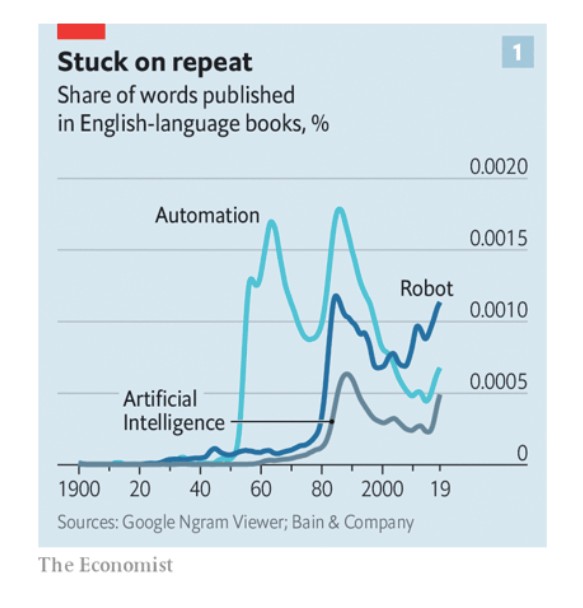 Οι φόβοι που αφορούν τις επιπτώσεις της τεχνολογίας στην κατάργηση θέσεων εργασίας δεν είναι, φυσικά, κάτι καινούργιο. Στις αρχές του 19ου αιώνα στη Βρετανία, οι Λουδίτες έκαιγαν εργοστασιακές μηχανές. Ο όρος «αυτοματοποίηση» έγινε για πρώτη φορά γνωστός όταν η υιοθέτηση των καινοτομιών της μηχανοποίησης κατά τη διάρκεια του πολέμου προκάλεσε κύμα πανικού για μια επικείμενη μαζική ανεργία τη δεκαετία του 1950 (βλ. διάγραμμα 1). Το 1978 η απάντηση του πρωθυπουργού της Βρετανίας, James Callaghan, στον μικροεπεξεργαστή, που ήταν η πρωτοποριακή τεχνολογία της εποχής του, ήταν να δώσει εντολή να γίνει μια κυβερνητική έρευνα σχετικά με τις πιθανότητες κατάργησης θέσεων εργασίας. Πριν από δέκα χρόνια, ο Carl Frey και ο Michael Osborne του Πανεπιστημίου της Οξφόρδης δημοσίευσαν μια καταπληκτική μελέτη, που έκτοτε έχει αναφερθεί πάνω από 5.000 φορές, υποστηρίζοντας ότι το 47% των εργασιών που εκτελούν οι Αμερικανοί εργαζόμενοι θα μπορούσαν να αυτοματοποιηθούν «μέσα στις επόμενες μία ή δύο δεκαετίες». Σήμερα ακόμα και ο τεχνο-αισιόδοξος κ. Musk αναρωτιέται τι θα σήμαινε αν τα ρομπότ ξεπερνούσαν αριθμητικά τους ανθρώπους: «Δεν είναι καν σαφής η εικόνα που θα έχει μια οικονομία όταν φτάσει σε αυτό το σημείο».