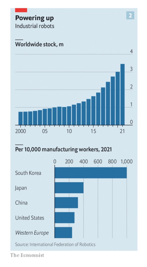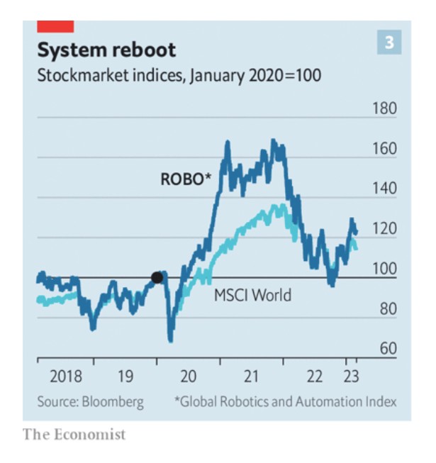 Ως αποτέλεσμα της καλύτερης τεχνολογίας και των χαμηλότερων τιμών, το παγκόσμιο απόθεμα βιομηχανικών ρομπότ αυξήθηκε από 1 εκατ. το 2011 σε σχεδόν 3,5 εκατ. το 2021 (βλ. διάγραμμα 2). Σε ετήσια βάση, οι πωλήσεις της Fanuc, μιας μεγάλης ιαπωνικής εταιρείας κατασκευής ρομπότ, αυξήθηκαν κατά 17% το τελευταίο τρίμηνο, ενώ εκείνες της Keyence, μιας ιαπωνικής εταιρείας που λειτουργεί ως σύμβουλος αυτοματισμού σε διάφορα εργοστάσια ανά τον κόσμο, εκτινάχθηκαν κατά 24%. Οι τιμές των μετοχών των κατασκευαστών ρομπότ, αν και μειωμένες σε σχέση με τις υψηλές τιμές του 2021, όταν οι εργοδότες αναζητούσαν εναλλακτικές λύσεις για το ανθρώπινο εργατικό δυναμικό που παρέμενε απενεργοποιημένο λόγω Covid-19, παραμένουν κατά ένα πέμπτο υψηλότερες απ’ ό,τι πριν από την πανδημία (βλ. διάγραμμα 3).