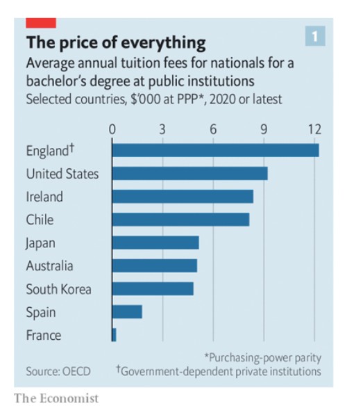 Ωστόσο, πρόσφατα το επίδομα πτυχίου σε πολλές χώρες είτε παρέμεινε στάσιμο, είτε άρχισε να μειώνεται. Και σε μέρη που χρεώνουν τους φοιτητές για τα πτυχία τους το κόστος έχει αυξηθεί (βλ. διάγραμμα 1). Τα δίδακτρα στην Αγγλία εκτοξεύτηκαν από το μηδέν στα τέλη της δεκαετίας του 1990 στις 9.250 λίρες (11.000 δολάρια) ετησίως, τα υψηλότερα στον πλούσιο κόσμο. Σύμφωνα με τους Jaison Abel και Richard Deitz της Ομοσπονδιακής Τράπεζας της Νέας Υόρκης, στην Αμερική τα δίδακτρα που καταβάλλει ένας μέσος φοιτητής για bachelor αυξήθηκαν, σε πραγματικούς όρους, από 2.300 δολάρια ετησίως τη δεκαετία του 1970 σε περίπου 8.000 δολάρια το 2018. (Οι φοιτητές στα δημόσια πανεπιστήμια συχνά πληρώνουν πολύ λιγότερα -εκείνοι στα ιδιωτικά μη κερδοσκοπικά ιδρύματα μπορεί να πληρώνουν πολύ περισσότερα).