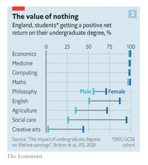 Σύμφωνα με το Ινστιτούτο Δημοσιονομικών Μελετών (IFS), ένα ερευνητικό ίδρυμα, στην Αγγλία το 25% των ανδρών πτυχιούχων και το 15% των γυναικών θα έχουν λιγότερες απολαβές κατά τη διάρκεια της καριέρας τους από τους συνομηλίκους τους που δεν πήραν πτυχίο. Τα στοιχεία στην Αμερική είναι ελλιπή, αλλά έχει ξεκινήσει να δημοσιεύει το ποσοστό των φοιτητών σε χιλιάδες ιδρύματα που δεν καταφέρνουν να κερδίσουν νωρίς περισσότερα από τον μέσο όρο των αποφοίτων λυκείου. Ερευνητές του Πανεπιστημίου Georgetown στην Ουάσινγκτον υπολογίζουν ότι έξι χρόνια μετά την εγγραφή τους, το 27% των φοιτητών σε ένα τυπικό τετραετές πανεπιστήμιο δεν τα καταφέρνει. Στη μακρά ουρά, που περιλαμβάνει το χειρότερο 30% των αμερικανικών ιδρυμάτων δύο και τεσσάρων ετών, περισσότεροι από τους μισούς που εγγράφονται υστερούν σε αυτόν τον δείκτη αναφοράς.