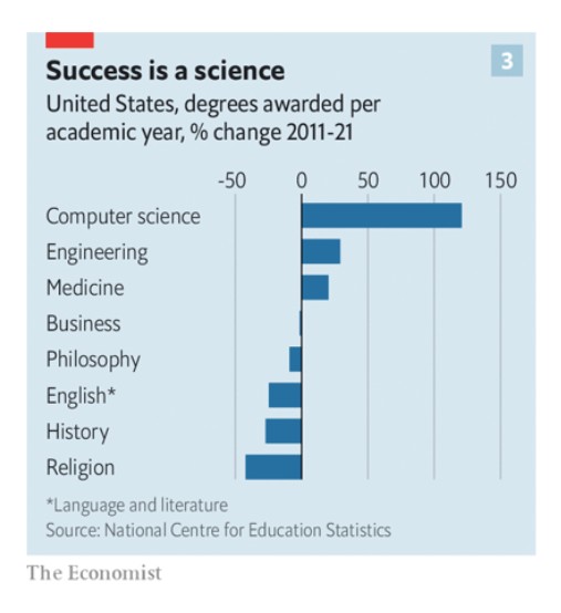 Ποιες είναι οι συνέπειες όλης αυτής της ανάλυσης; Ήδη υπάρχουν ενδείξεις ότι η αγορά της τριτοβάθμιας εκπαίδευσης εξελίσσεται. Οι άνθρωποι αναζητούν ήδη από μόνοι τους καλύτερες αποδόσεις σε διάφορα εκπαιδευτικά στάδια. Στην Αμερική ο αριθμός των πτυχίων που απονέμονται ετησίως στα αγγλικά και στην ιστορία μειώθηκε κατά περίπου κατά ένα τρίτο μεταξύ 2011 και 2021. Ο αριθμός των πτυχίων στην επιστήμη των υπολογιστών υπερδιπλασιάστηκε σε αυτό το διάστημα (βλ. διάγραμμα 3). Άλλοι παραλείπουν εντελώς το κολέγιο. Ο αριθμός των ατόμων που εγγράφονται σε κολέγια μειώνεται συνεχώς κάθε χρόνο από το 2011.