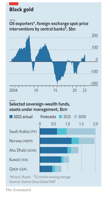 Ο πόλεμος και οι κυρώσεις έχουν αυξήσει τις τιμές των υδρογονανθράκων, πράγμα που σημαίνει ότι οι εξαγωγείς καυσίμων κολυμπούν στο χρήμα. Κατά τη διάρκεια προηγούμενων εκρήξεων ανακύκλωναν τα έσοδα στις δυτικές κεφαλαιαγορές, αγοράζοντας τετριμμένα, υπερρευστοποιήσιμα περιουσιακά στοιχεία μέσω τραπεζών που εδρεύουν σε υπεράκτιες χώρες, μέσω μιας σιωπηρής συμφωνίας: Η Αμερική θα προσέφερε στρατιωτική βοήθεια και θα αγόραζε πετρέλαιο από τη Σαουδική Αραβία και τους φίλους της, με αντάλλαγμα να καλύψουν το τεράστιο έλλειμμα τρεχουσών συναλλαγών του θείου Σαμ με πετροδολάρια. Το κυνήγι ταλέντων υποδηλώνει ότι η συμφωνία καταρρέει. Ο θείος Σαμ, σημαντικός πλέον εξαγωγέας πετρελαίου, είναι πλέον λιγότερο θελκτικός εταίρος. Τα κράτη του Κόλπου, που προσελκύονται από την Ασία και είναι πρόθυμα να αποκαταστήσουν τους δεσμούς με το Ισραήλ και, τελευταία, με το Ιράν, δεν αισθάνονται πλέον υποχρεωμένα να είναι αρεστά στον Λευκό Οίκο. Στις 2 Απριλίου η Σαουδική Αραβία και οι σύμμαχοί της εξόργισαν την Αμερική ανακοινώνοντας περικοπές στην παραγωγή αργού πετρελαίου της τάξεως των σχεδόν 4 εκατ. βαρελίων ημερησίως, που ισοδυναμεί με το 4% της παγκόσμιας παραγωγής, γεγονός που βοήθησε στην άνοδο των τιμών. Αισθάνονται επίσης πιο ελεύθεροι να χρησιμοποιούν τα βουνά των μετρητών τους όπως επιθυμούν.