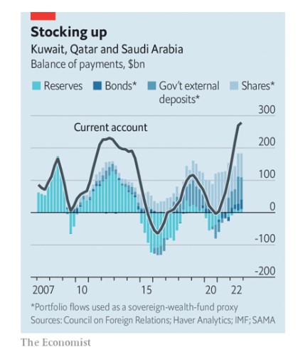 Δεν είναι όλοι σε θέση να επωφεληθούν πραγματικά. Οι κυβερνήσεις του Μπαχρέιν και του Ιράκ είναι τόσο τεράστιες που, ακόμα και με υψηλότερα έσοδα, μετά βίας επιτυγχάνουν ισοσκελισμό. Αντιθέτως, τα τέσσερα μεγαλύτερα μέλη του Συμβουλίου Συνεργασίας του Κόλπου (GCC), το Κουβέιτ, το Κατάρ, τα Ηνωμένα Αραβικά Εμιράτα και η Σαουδική Αραβία είναι αυτά που συγκεντρώνουν το μεγαλύτερο μέρος των εσόδων. Ο Alex Etra της Exante, μιας εταιρείας δεδομένων, εκτιμά ότι το συνδυασμένο πλεόνασμα τρεχουσών συναλλαγών τους το 2022 ήταν 350 δισ. δολάρια. Οι τιμές του πετρελαίου έχουν μειωθεί από πέρυσι, όταν το αργό τύπου Brent, το παγκόσμιο σημείο αναφοράς, ήταν κατά μέσο όρο 100 δολάρια το βαρέλι. Ωστόσο, αν υποθέσουμε ότι θα παραμείνει κοντά στα 85 δολάρια – ένα συντηρητικό στοίχημα- ο κ. Etra εκτιμά ότι το 2023 οι τέσσερις γίγαντες θα μπορούσαν να βάλουν στην τσέπη τους πλεόνασμα 300 δισ. δολαρίων. Αυτό αθροιστικά μας κάνει 650 δισ. δολάρια μέσα σε δύο χρόνια.