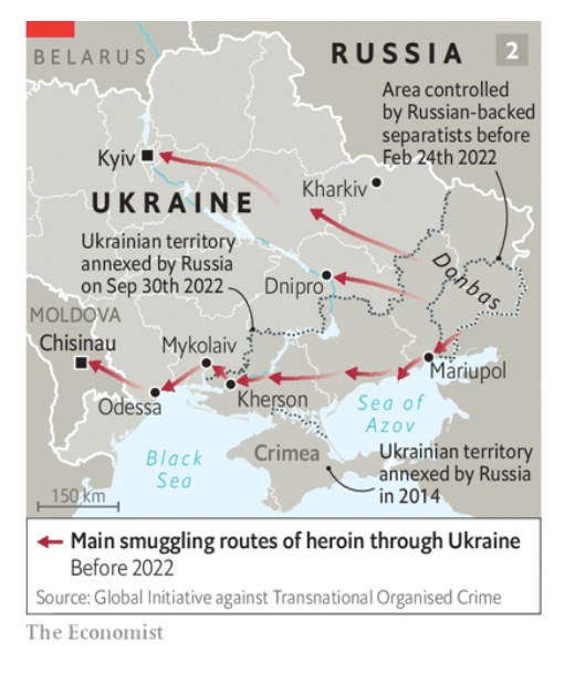 Η εισβολή της Ρωσίας έπληξε αυτόν τον υπόκοσμο με τη δύναμη ενός σεισμού (βλ. χάρτη 1). Η συντριπτική πλειονότητα των σκληροτράχηλων Ουκρανών μαφιόζων έχει σταματήσει να συνεργάζεται με τους Ρώσους ομοϊδεάτες τους: «Είμαστε κλέφτες, είμαστε εναντίον οποιουδήποτε κράτους, αλλά αποφασίσαμε ότι είμαστε υπέρ της Ουκρανίας», λέει ένας από αυτούς. Οι προσοδοφόρες διαδρομές του λαθρεμπορίου ηρωίνης επαναχαρτογραφούνται, επηρεάζοντας τις τιμές και τα κέρδη των συνδικάτων του εγκλήματος χιλιάδες μίλια μακριά. Αν η αναστάτωση διαρκέσει, θα μπορούσε να αλλάξει το πρόσωπο του παγκόσμιου εγκλήματος. Φυσικά, θα αλλάξει και την Ουκρανία.