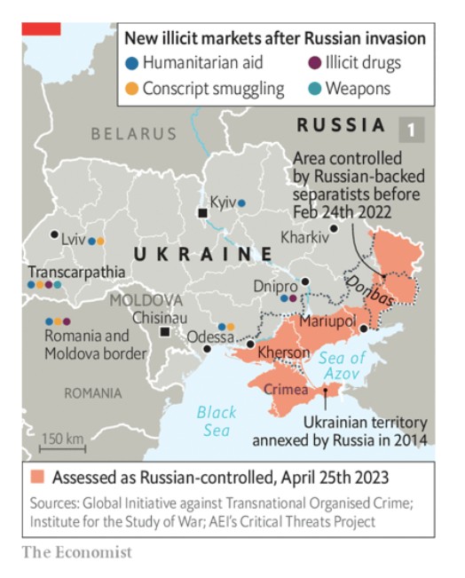 Οι επιπτώσεις γίνονται αισθητές σε παγκόσμιο επίπεδο, καθώς τα δίκτυα λαθρεμπορίου αναδιαμορφώνονται για να παρακάμψουν την Ουκρανία. Τούρκοι τελωνειακοί αξιωματούχοι λένε ότι η περισσότερη ηρωίνη και μεθαμφεταμίνη ρέουν από τα σύνορα με το Ιράν. Οι Λιθουανοί συνοριακοί υπάλληλοι βρέθηκαν αντιμέτωποι με τετραπλάσια ετήσια αύξηση του όγκου του παράνομου καπνού το πρώτο τρίμηνο του 2022. Εσθονοί αξιωματούχοι που συνεργάζονται με τη Europol, την αστυνομική υπηρεσία της ΕΕ, δέσμευσαν πέρυσι στο λιμάνι της Muuga 3,5 τόνους κοκαΐνης από τη Λατινική Αμερική, αξίας περίπου μισού δισεκατομμυρίου ευρώ. Ο αποκλεισμός των λιμανιών της Ουκρανίας στη Μαύρη Θάλασσα και οι αυξημένοι έλεγχοι στη Δυτική Ευρώπη μπορούν επίσης να εξηγήσουν τις μεγάλες κατασχέσεις που έγιναν πρόσφατα στη Ρωσία. Στις 10 Απριλίου οι Αρχές κατέσχεσαν σχεδόν 700 κιλά κοκαΐνης στη Μόσχα. Οι Ρώσοι μαφιόζοι κοντά στα σύνορα με τη Λευκορωσία, που κάποτε ήταν περιθωριοποιημένοι, επωφελούνται από το λαθρεμπόριο ειδών πολυτελείας προς στη Ρωσία, ιδίως τσάντες σχεδιαστών.