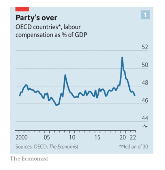 Προς το παρόν τα στοιχεία δείχνουν ισοδυναμία. Υπολογίσαμε το μερίδιο της εργασίας σε όλες τις χώρες του ΟΟΣΑ. Η εργασία είχε το πάνω χέρι για τα περισσότερα από τα τελευταία τρία χρόνια, αν και πιο πρόσφατα το μερίδιό της μειώθηκε (βλ. διάγραμμα 1). Το 2020 οι επιχειρήσεις συνέχισαν να πληρώνουν τους μισθούς των εργαζομένων -βοηθούμενες από τα προγράμματα τόνωσης της οικονομίας-, ακόμα και όταν το ΑΕΠ μειώθηκε. Το 2021 και το 2022 η ισχυρή ζήτηση για εργατικά χέρια επέτρεψε σε πολλούς εργαζομένους να ζητήσουν αύξηση αποδοχών, ενώ προσέλκυσε νέα άτομα στο εργατικό δυναμικό. Σε ολόκληρο τον ΟΟΣΑ το ποσοστό των εργαζομένων που βρίσκονται σε ηλικία εργασίας ανέρχεται στο 70%, το υψηλότερο επίπεδο όλων των εποχών.