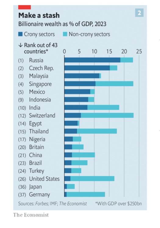 Η Ρωσία είναι, για μια ακόμα φορά, η πιο πελατειακή καπιταλιστική χώρα στον δείκτη μας (βλ. διάγραμμα 2). Ο πλούτος των δισεκατομμυριούχων από τους πελατειακούς τομείς ανέρχεται στο 19% του ΑΕΠ. Ωστόσο, οι συνέπειες του πολέμου στην Ουκρανία είναι σαφείς. Ο πλούτος των Κροίσων μειώθηκε από 456 δισ. δολάρια το 2021 σε 387 δισ. δολάρια φέτος. Μόνο το ένα πέμπτο του πλούτου των Ρώσων δισεκατομμυριούχων προέρχεται από μη πελατειακούς τομείς, γεγονός που δείχνει πόσο στρεβλή είναι η οικονομία.