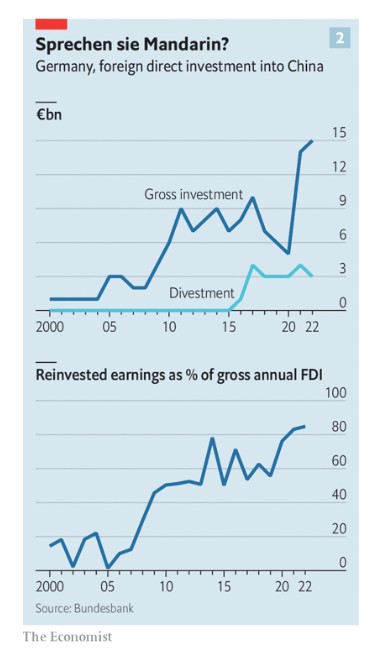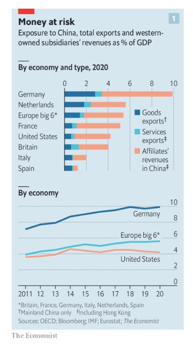 Η συνολική έκθεση των έξι μεγάλων ευρωπαϊκών χωρών στην Κίνα έφτασε το 5,6% του συνδυασμένου ΑΕΠ τους, από 3,9% το 2011. Το ποσοστό αυτό είναι υψηλότερο από το 4,2% της Αμερικής. Το εύρος είναι μεγάλο: η Ιταλία και η Ισπανία βρίσκονται μόλις στο 1%-2%, η Γαλλία και η Βρετανία στο 4%-5%. Η Γερμανία αποτελεί τεράστια εξαίρεση, με 9,9%. Τα δύο τρίτα της έκθεσης των έξι μεγάλων ευρωπαϊκών χωρών προέρχονται από τις πωλήσεις των θυγατρικών τους στην Κίνα και όχι από τις εξαγωγές από την Ευρώπη. Συχνά πρόκειται για τους κινεζικούς βραχίονες βιομηχανικών κολοσσών, όπως η Volkswagen και η BASF.