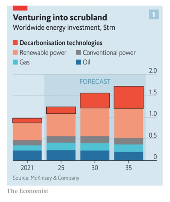 Το Υπουργείο Ενέργειας της Αμερικής υπολογίζει ότι οι κλιματικοί στόχοι της χώρας απαιτούν τη δέσμευση και αποθήκευση 400 έως 1,8 δισ. τόνων CO2 ετησίως έως το 2050, από 20 εκατ. τόνους σήμερα. Η συμβουλευτική εταιρεία στον τομέα της ενέργειας Wood Mackenzie υπολογίζει ότι σε παγκόσμιο επίπεδο οι διάφορες μορφές απανθρακοποίησης αντιπροσωπεύουν το ένα πέμπτο των μειώσεων των εκπομπών που απαιτούνται για την επίτευξη καθαρών μηδενικών εκπομπών αερίων του θερμοκηπίου έως το 2050. Εάν η Wood Mackenzie έχει δίκιο, και δεδομένου ότι η ανθρωπότητα εκλύει περισσότερους από 40 δισ. τόνους ετησίως, αυτό θα ισοδυναμούσε με την απορρόφηση περισσότερων από 8 δισ. τόνων CO2 ετησίως. Και αυτό απαιτεί πάρα πολλές επιχειρήσεις απανθρακοποίησης σε βιομηχανική κλίμακα (βλ. διάγραμμα 1).