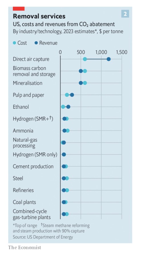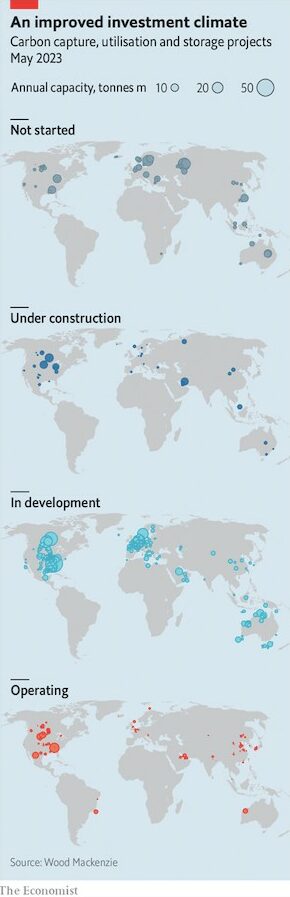 Ορισμένα από τα εκατοντάδες δισεκατομμύρια δολάρια των πρόσφατα εγκεκριμένων αμερικανικών κονδυλίων για το κλίμα αποσκοπούν στην ενίσχυση της βιομηχανίας απανθρακοποίησης. Μια ενισχυμένη έκπτωση φόρου που περιλαμβάνεται σε έναν από τους νόμους, τον Νόμο για τη Μείωση του Πληθωρισμού, παρέχει έως και 85 δολάρια ανά τόνο CO2 που αποθηκεύεται μόνιμα (καθώς και 60 δολάρια ανά τόνο CO2 που χρησιμοποιείται για την ενισχυμένη ανάκτηση πετρελαίου, η οποία επίσης δεσμεύει το CO2 αν και για να παραχθούν περισσότεροι υδρογονάνθρακες). Η Clio Crespy, της επενδυτικής εταιρείας Guggenheim Securities, υπολογίζει ότι η έκπτωση αυτή δεκαπλασιάζει, από άποψη οικονομικού πλεονεκτήματος, τον όγκο των εκπομπών στην Αμερική που μπαίνουν στο στόχαστρο της απανθρακοποίησης. Η αντίδραση της ΕΕ στον κλιματικό μποναμά της Αμερικής είναι πιθανό να προωθήσει επίσης την απανθρακοποίηση. Νωρίτερα φέτος η ΕΕ και η Νορβηγία ανακοίνωσαν μια “πράσινη συμμαχία” για την ενίσχυση των περιφερειακών σχεδίων δέσμευσης του άνθρακα.