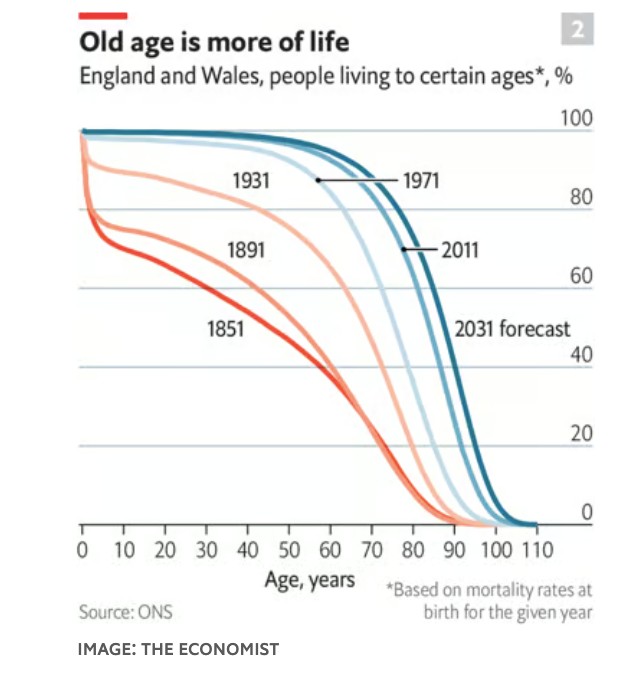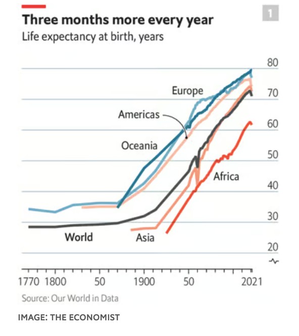 Τα πράγματα έχουν βελτιωθεί από τη βασιλεία της Ελισάβετ Α’. Οι άνθρωποι στον πλούσιο κόσμο μπορούν πλέον να υποθέσουν εύλογα ότι οι ημέρες τους θα διαρκέσουν πολύ περισσότερο από τα 70. Οι φτωχότερες χώρες πλησιάζουν (βλ. διάγραμμα 1). Σε κάθε έτος από το 1950 το μέσο προσδόκιμο ζωής σε όλο τον κόσμο αυξήθηκε κατά 18 εβδομάδες.