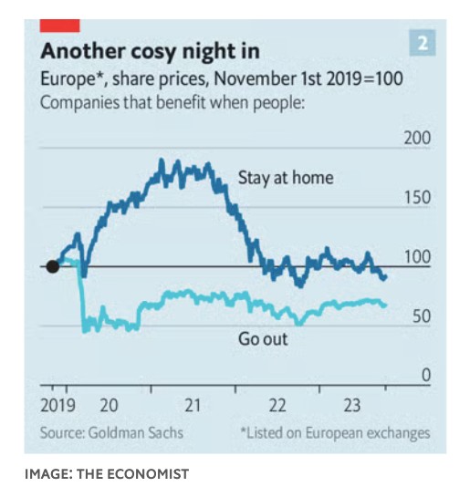 Οι επιχειρήσεις παρατηρούν αυτήν τη μετατόπιση των 600 δισ. δολαρίων. Σε μια πρόσφατη ανακοίνωση των κερδών, ένα στέλεχος της Darden Restaurants, η οποία διαχειρίζεται μία από τις καλύτερες αλυσίδες εστιατορίων της Αμερικής, την Olive Garden, σημείωσε ότι, σε σχέση με την προπανδημική εποχή, «βρισκόμαστε πιθανώς στο 80% της επισκεψιμότητας». Στην Home Depot, η οποία πουλάει εργαλεία για τη βελτίωση του σπιτιού, τα έσοδα, σε πραγματικούς όρους, είναι αυξημένα κατά περίπου 15% σε σχέση με το 2019. Οι επενδυτές το παρατηρούν. Η τράπεζα Goldman Sachs παρακολουθεί τις τιμές των μετοχών των εταιρειών που τείνουν να επωφελούνται όταν οι άνθρωποι μένουν στο σπίτι (όπως οι εταιρείες ηλεκτρονικού εμπορίου) και εκείνων που ευημερούν όταν οι άνθρωποι είναι έξω και κυκλοφορούν (όπως οι αεροπορικές εταιρείες). Ακόμα και σήμερα, η αγορά είναι ευνοϊκή απέναντι στις επιχειρήσεις που εξυπηρετούν τους ανθρώπους που μένουν στο σπίτι (βλ. διάγραμμα 2).