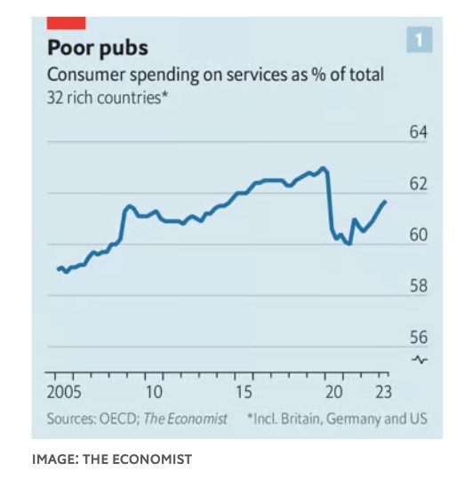 Κατά τα έτη πριν από την πανδημία το μερίδιο των καταναλωτικών δαπανών που αφορούσε τις υπηρεσίες αυξανόταν σταθερά. Καθώς οι κοινωνίες γίνονταν πλουσιότερες, απαιτούσαν περισσότερες εμπειρίες πολυτέλειας, υγειονομική περίθαλψη και οικονομικό προγραμματισμό. Στη συνέχεια, το 2020, οι δαπάνες για υπηρεσίες, από τη διαμονή σε ξενοδοχεία έως το κούρεμα, κατέρρευσαν λόγω των υγειονομικών περιορισμών. Καθώς οι άνθρωποι περνούσαν περισσότερο χρόνο στο σπίτι, η ζήτηση για αγαθά αυξήθηκε κατακόρυφα, με μια βιασύνη για απόκτηση ηλεκτρονικών υπολογιστών και ποδηλάτων γυμναστικής.