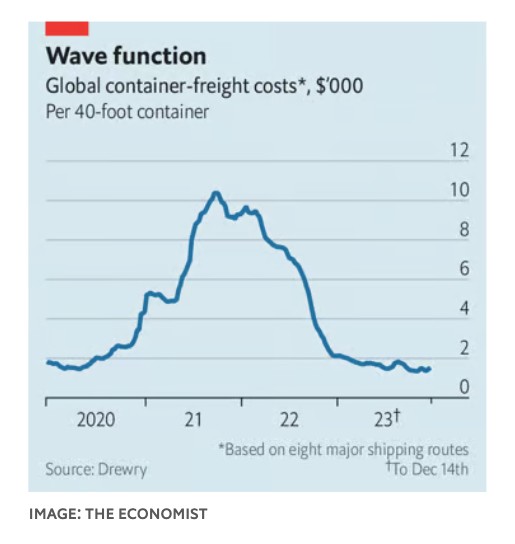 Η συνήθης αντίδραση των ναυτιλιακών εταιρειών σε τέτοια μηνύματα τιμών είναι η παραγγελία νέων πλοίων, τα οποία αρχίζουν να καταφθάνουν. Παρόλο που η ζήτηση παρέμεινε στάσιμη τα τελευταία ένα ή δύο χρόνια, η χωρητικότητα του παγκόσμιου στόλου, σύμφωνα με την τράπεζα ING, θα διογκωθεί κατά 9% φέτος και κατά άλλο 11% το 2024. Ήδη, τα κέρδη της βιομηχανίας μπορεί να έπεσαν κατά 80% το 2023. Με την πλεονάζουσα χωρητικότητα, η εκτέλεση μεγαλύτερων δρομολογίων δεν αναμένεται να προκαλέσει την αναστάτωση που παρατηρήθηκε στο αποκορύφωμα της Covid-19. Μέχρι τα μέσα Δεκεμβρίου ο δείκτης Drewry’s ήταν αβέβαιος στα 1.500 δολάρια περίπου (βλ. διάγραμμα). O Peter Sand της Xeneta, μιας εταιρείας εμπορευματικών δεδομένων εκτιμά ότι οι τιμές θα μπορούσαν να διπλασιαστούν ως αποτέλεσμα της αναταραχής στην Ερυθρά Θάλασσα. Ωστόσο, πιθανότατα θα παραμείνουν αρκετά κάτω από τις κορυφώσεις τους κατά τη διάρκεια της πανδημίας. Το ίδιο αναμένεται και για τα κέρδη των ναυτιλιακών εταιρειών.