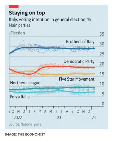Κατά τα άλλα, η κ. Meloni «έχει όλο και περισσότερο τον έλεγχο των πραγμάτων», λέει ο Lorenzo Castellani, ο οποίος διδάσκει πολιτική στο πανεπιστήμιο Luiss της Ρώμης. Ο συνασπισμός της έχει μια άνετη πλειοψηφία και παραμένει ενωμένος, παρά τις διαμάχες. Πρόσφατες δημοσκοπήσεις δίνουν στο κόμμα Αδελφοί της Ιταλίας (FDI) της πρωθυπουργού σχεδόν 29%, έναντι μόλις 9% για τη Λέγκα του Βορρά υπό τον Matteo Salvini και 7% για τη Forza Italia, που στερείται του ιδρυτή της, Silvio Berlusconi, ο οποίος απεβίωσε τον περασμένο Ιούνιο. Οι προσπάθειες του κ. Salvini να ανακτήσει την υποστήριξη που έχασε από τους Αδελφούς με μια όλο και σκληρότερη στάση δεν έχουν δώσει μέχρι στιγμής στη Λέγκα καλύτερα ποσοστά. Η αντιπολίτευση είναι διχασμένη μεταξύ του κεντροαριστερού Δημοκρατικού Κόμματος (PD) και του μικρότερου και λαϊκιστικού Κινήματος Πέντε Αστέρων. Οι δημοσκοπήσεις δείχνουν ότι η Elly Schlein του Δημοκρατικού Κόμματος είναι η λιγότερο δημοφιλής από τους κύριους ηγέτες των κομμάτων της Ιταλίας.