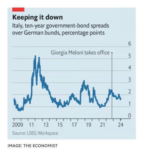 Η αναμενόμενη τόνωση της οικονομίας όταν τα χρήματα τελικά φτάσουν στο στόχο τους είναι ένας σημαντικός λόγος για τον οποίο δεν έχει πωληθεί ιταλικό χρέος, παρά την αύξηση των επιτοκίων και το έλλειμμα που έχει διογκωθεί από το 2019. Ένας άλλος λόγος είναι ότι η Ευρωπαϊκή Κεντρική Τράπεζα (ΕΚΤ) κατέστησε σαφές τον Ιούνιο του 2022 ότι δεν θα ανεχόταν πολύ μεγαλύτερη διαφορά μεταξύ των ιταλικών επιτοκίων και των επιτοκίων της Γερμανίας, που αποτελούν το σημείο αναφοράς του μπλοκ. Βέβαια, η ΕΚΤ, όπως και η Επιτροπή, αναμένει συνεχείς διαρθρωτικές μεταρρυθμίσεις σε αντάλλαγμα για τη στήριξή της. Δεν είναι καθόλου σαφές αν η κυβέρνηση της κας Meloni είναι πρόθυμη να τις πραγματοποιήσει.